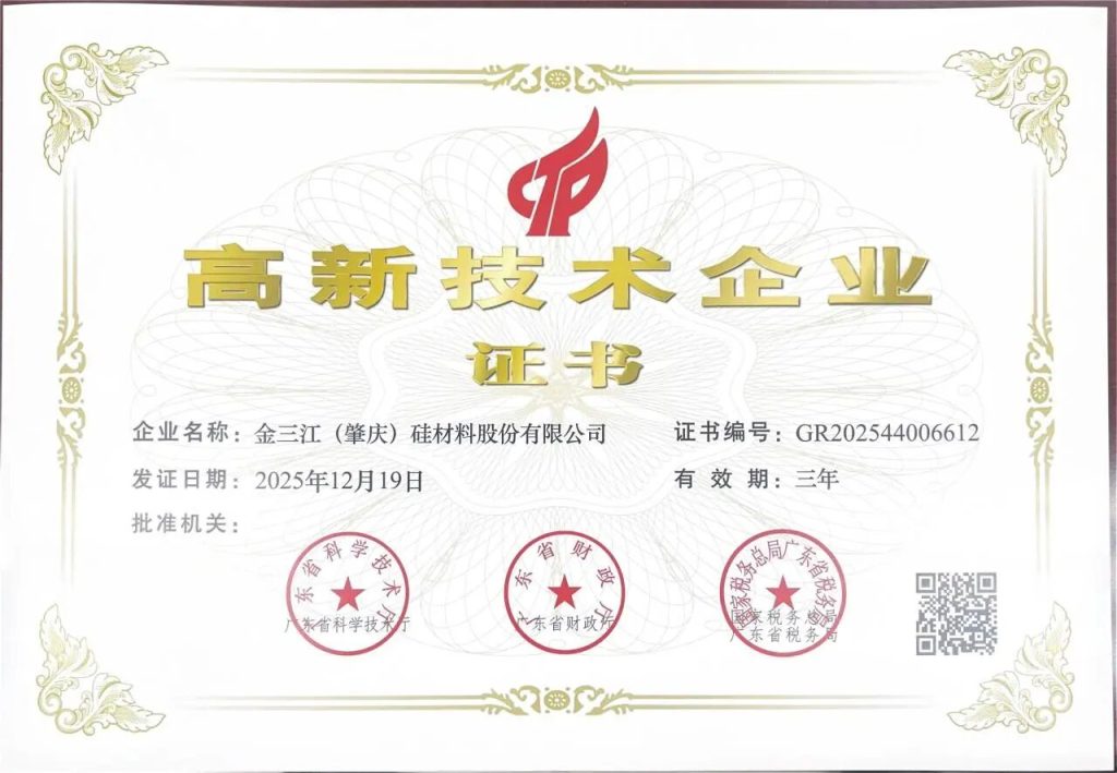 JSJ (Zhaoqing) Silicon Materials Co., Ltd. has completed its re-certification as a National High-Tech Enterprise.